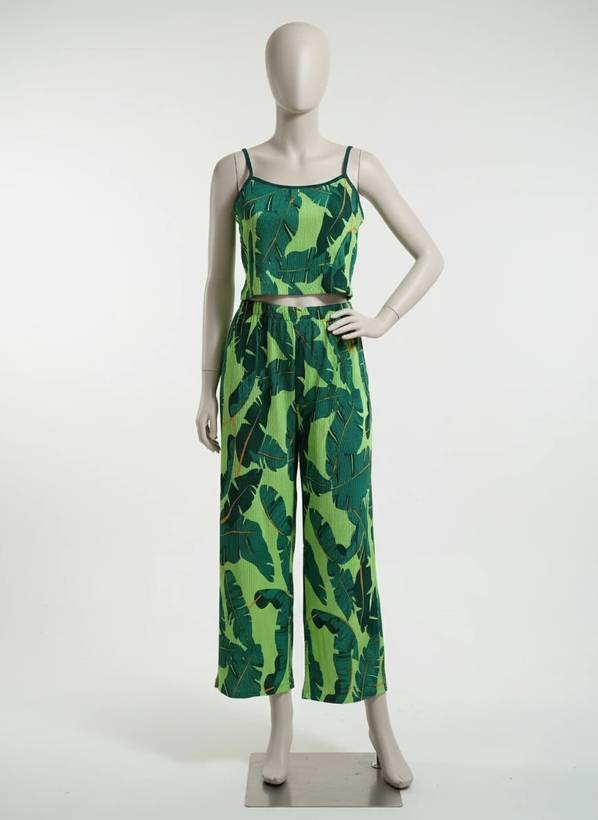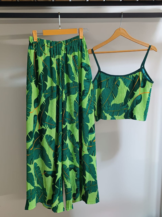 ست زیبا شامل تاپ بنددار و شلوار آزاد است که از پارچه سیلک پلیسه نرم و لطیف دوخته شده است. جنس سیلک با بافتهای ریز پلیسه، علاوه بر زیبایی و انعطاف بالا، باعث میشود لباس سبک و خنک باشد و حرکت را بسیار راحت کند.